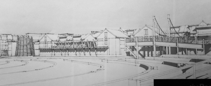 A pedestrian bridge? Located where a bridge was torn down? And what’s with the wanky roof shapes?