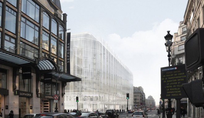 The top image is of the Clemson proposal. The second and third images, below, are of the RAMSA proposal and the thankfully rejected proposal by La Samaritaine in Paris. In regard to the latter, you can tell from the architect’s rendering that to communicate a sense of what the final structure will look like is the last thing they want. I think someone ought to do a psychological study of the field of architectural illustration – although the RAMSA drawing suggests that there remain some outposts of sanity in that community of artists.