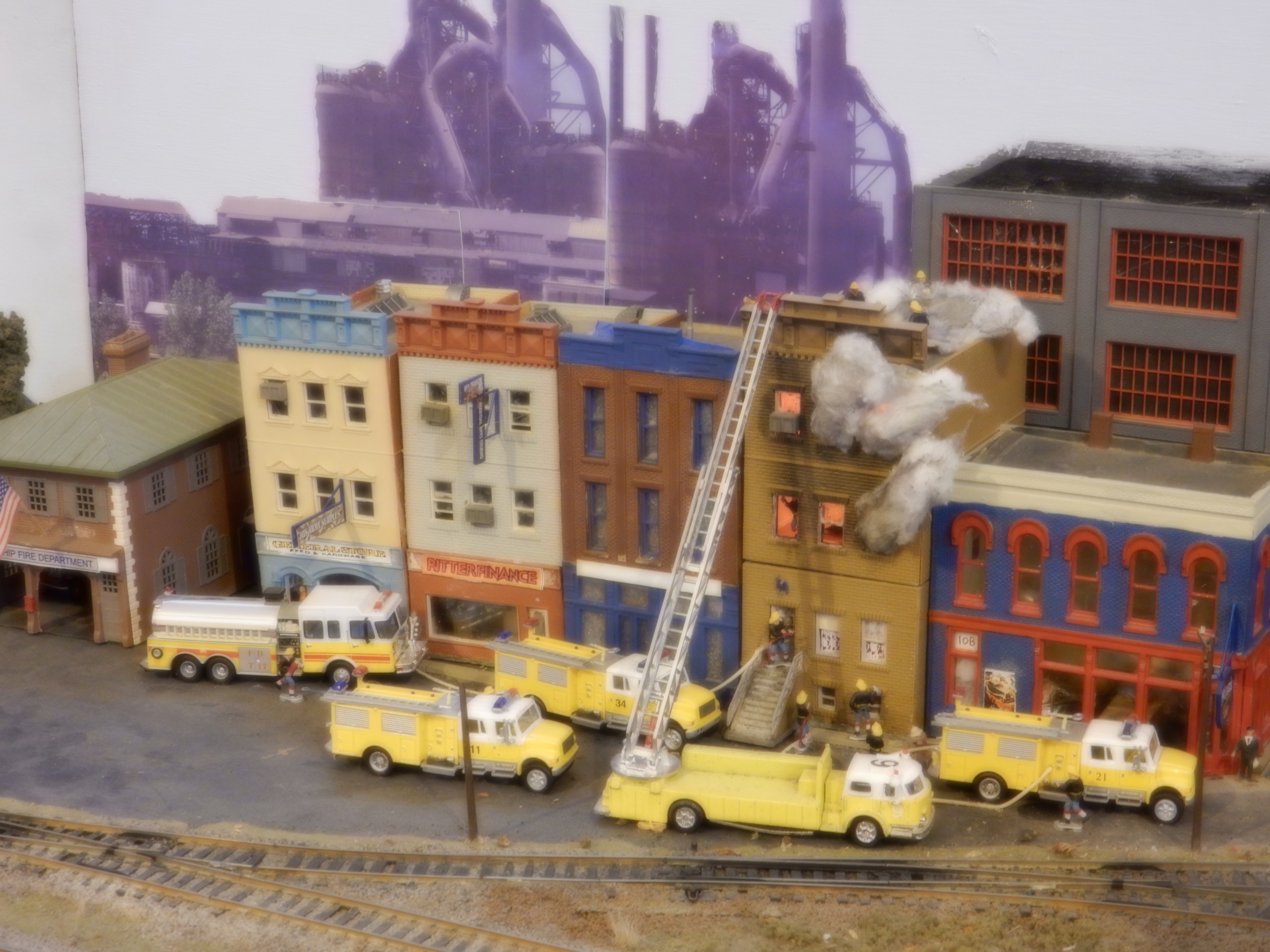 Fire afflicts rowhouse along HO-scale trackage.