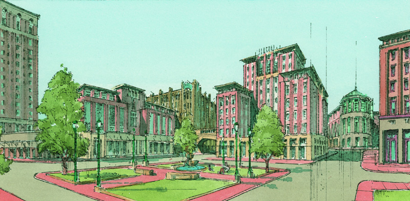 In addition, Chace has expressed his desire to build four- or five-story commercial and residential buildings on the two lots across Fountain where Journal employees park. They would be included in the purchase from Belo, of Dallas, the Journal’s former owner. Chace has eyed those two lots for years, since 2005 when urbanist Andres Duany was last here to help plan the next moves downtown. In a charrette, Duany showed two new buildings, both attractive, one on the lot near the Biltmore Hotel and another replacing the Journal’s green, snub-nosed parking garage facing a revamped Emmett Square.