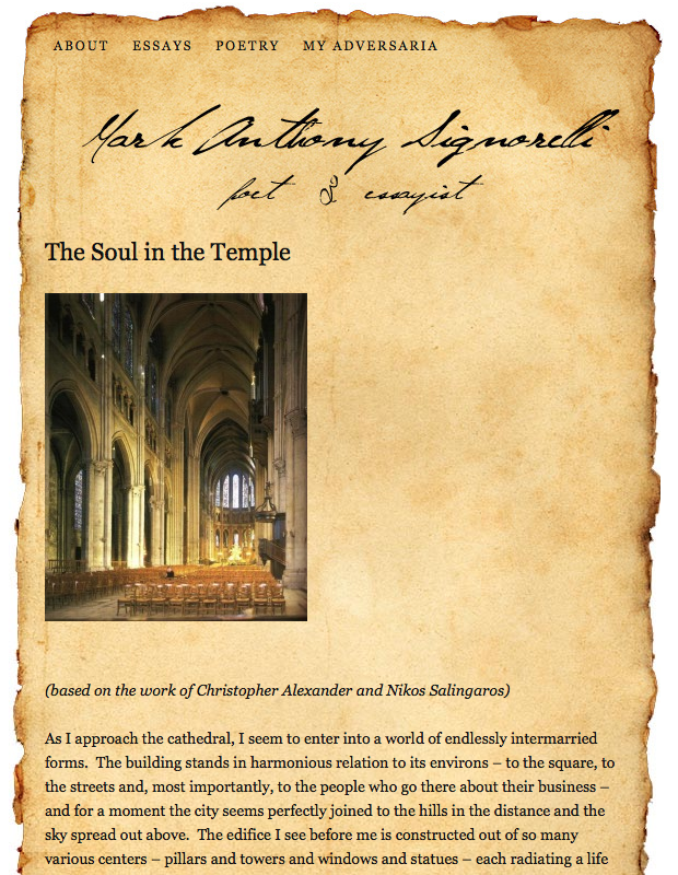 Nikos Salingaros, the theorist of architecture’s debt to biology, has sent me an essay by his sometime collaborator Mark Anthony Signorelli. Nikos describes “The Soul in the Temple” as “very insightful and very poetic (well, Mark is a poet!).” I would second that emotion while ramping it up more than a few notches. A year or so ago, Mark and Nikos wrote a call to arms for artists (and architects), “The Tyranny of Artistic Modernism,” an essay that still sends shivers of joy up my timbers. This latest essay is more an attempt to suggest the connectedness between architecture and nature – it picks up on the thinking of Nikos and fellow theorist Christopher Alexander – as it might be described not in the terms of science but of poetry. Here is an example, tracing his reflections after he has entered a ancient cathedral and reacted to its vaulting beauty: