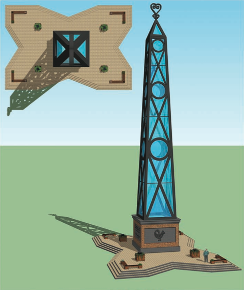 The student designs are joined by that of their teacher, who has submitted “A Tree of Light & Hush Harbor,” a 100-foot obelisk of steel, illuminated from within, backlighting on each of four sides the branches of a tree motif on top of which sits a sankofa, a bird plucking a seed from its own back – just beneath the obelisk’s crown, a prismatic blue glass beacon. To the side of the obelisk’s base is a circle of megalithic chairs – a “hush harbor,” or secret place for slaves to gather beyond the eyes of their owners and overseers.