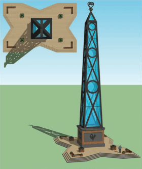 - “Looking Backward, Moving Upward,” by Megan Harris, Shelby Konold, Rachel Moore and Miranda Symons – an illuminated 116-foot obelisk of wrought iron and glass;