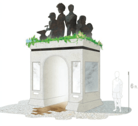 - “Bridge of Progress,” by Kylie Beall, Mitchell Moon, P.J. Roberson and Matthew Timbes – an intimately scaled limestone arch topped by historic figures;