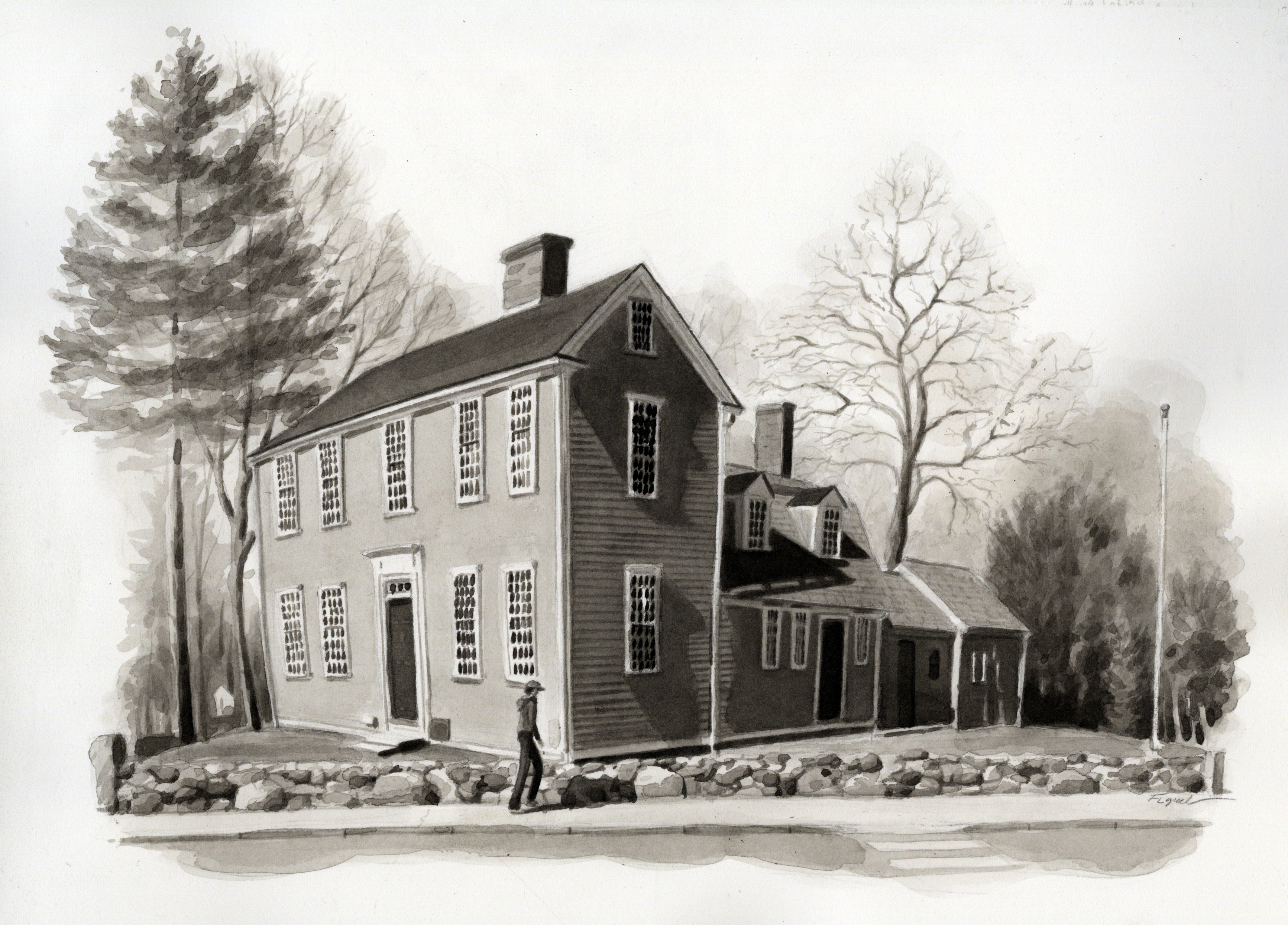 Here are some sketches of the houses of the founding fathers. George Washington’s Mount Vernon occupies, of course, pride of place. Benjamin Franklin’s house does not remain, alas, not unlike houses of some of the other founders, but at least Franklin’s memory was not besmirched by the sort of abomination that “represents” Franklin Court, in Philadelphia. As I could not find an image of Samuel Adams’s own house, I used the house he was hiding in at Lexington when the British were coming.