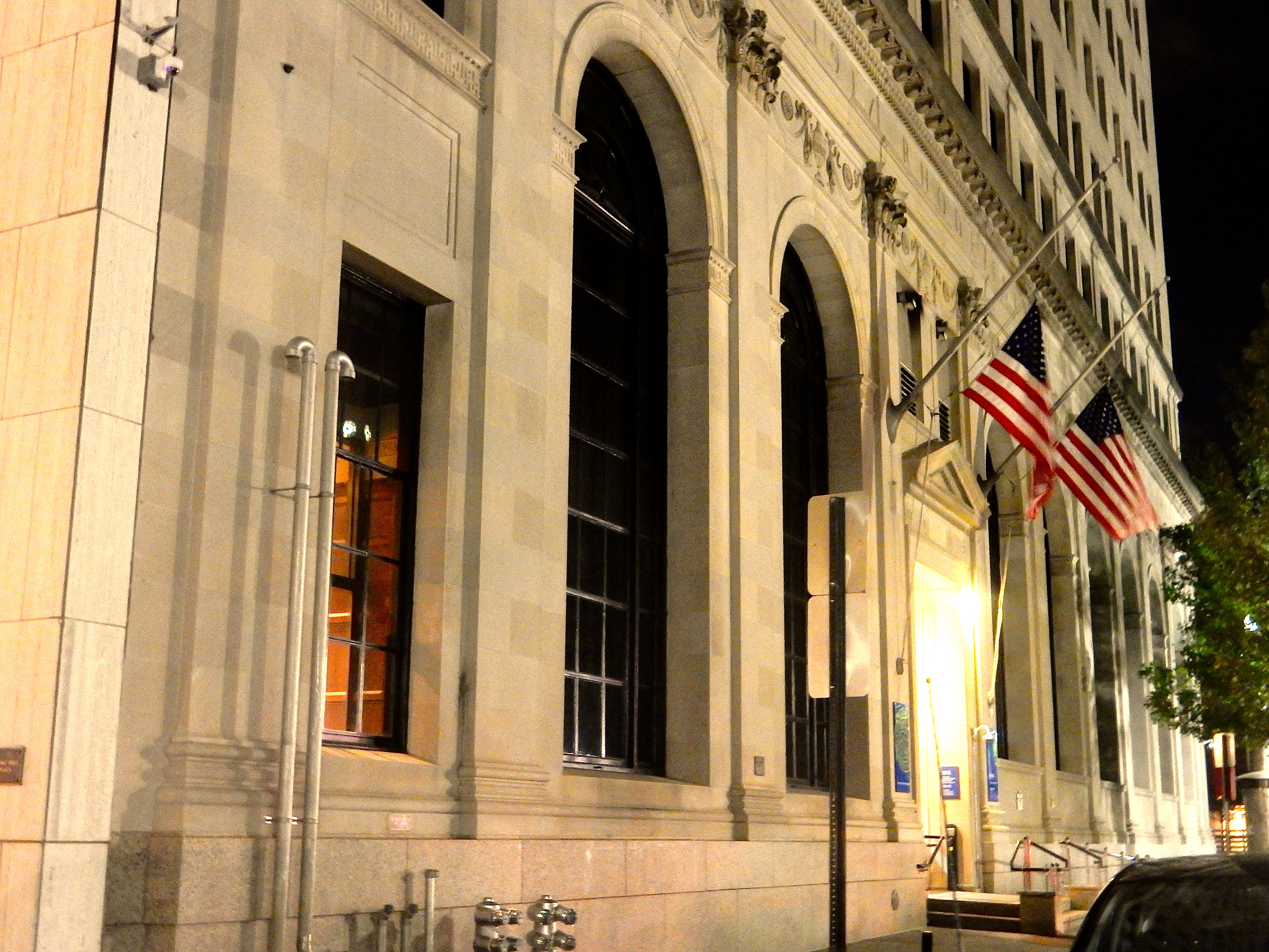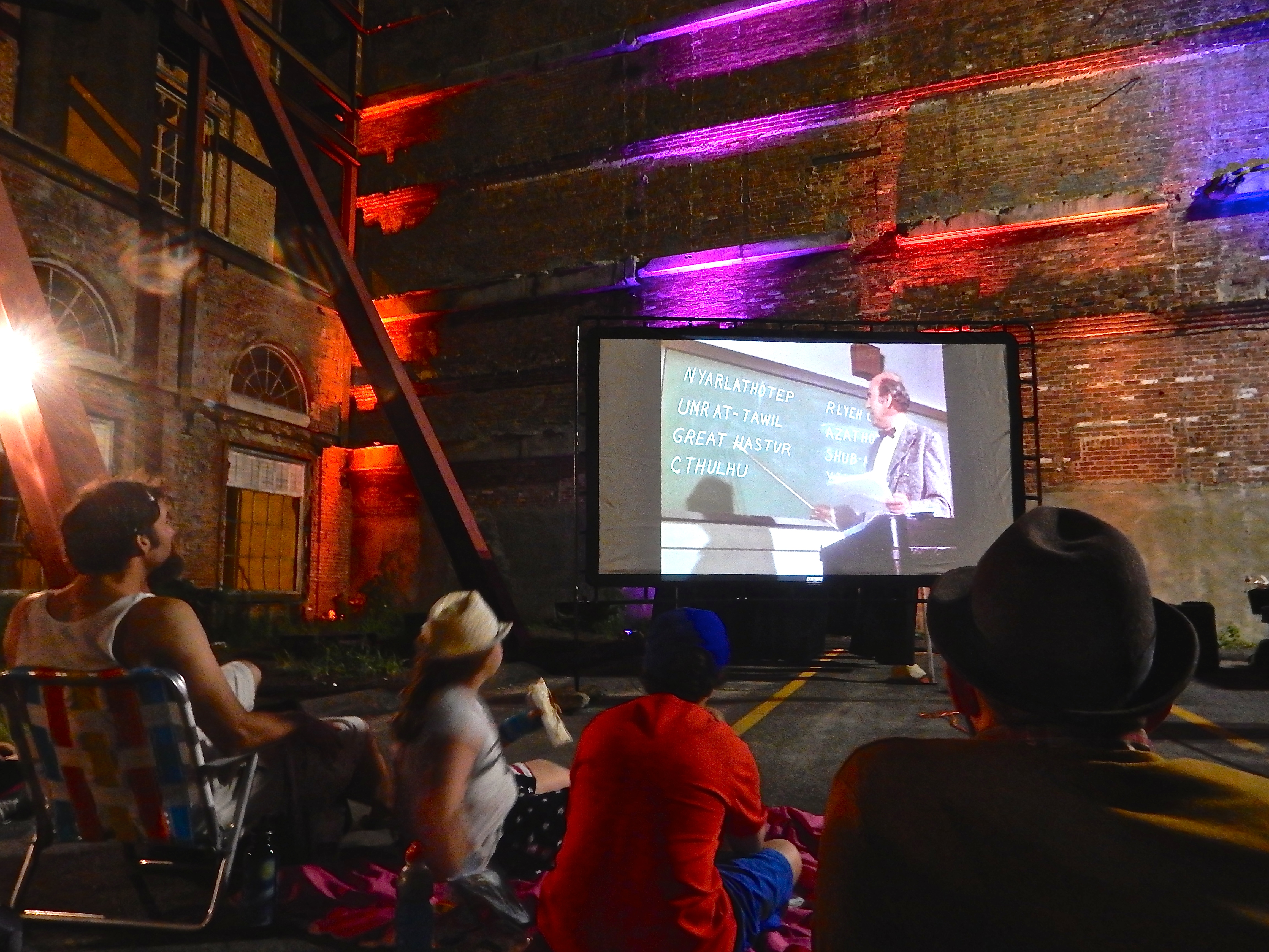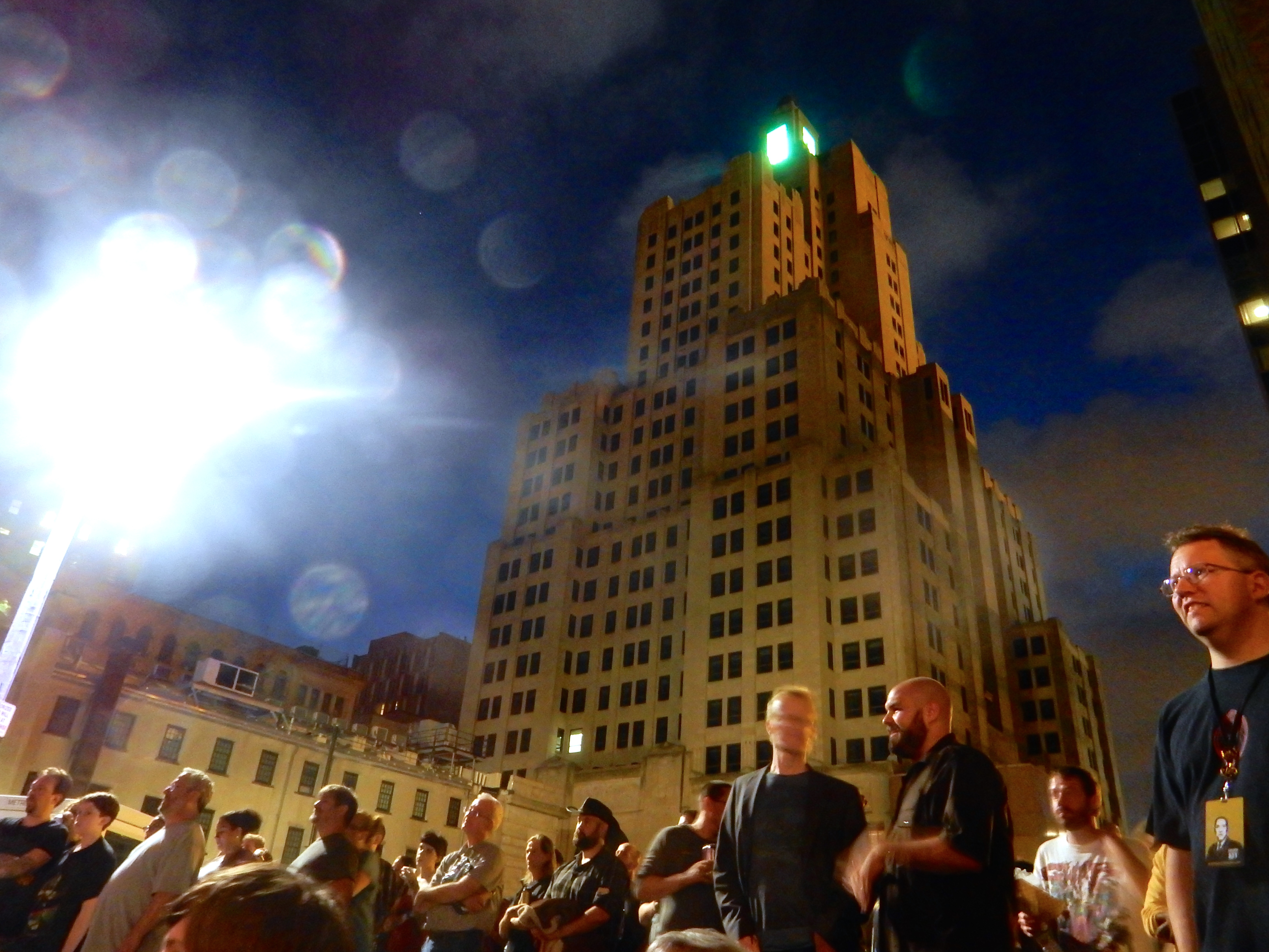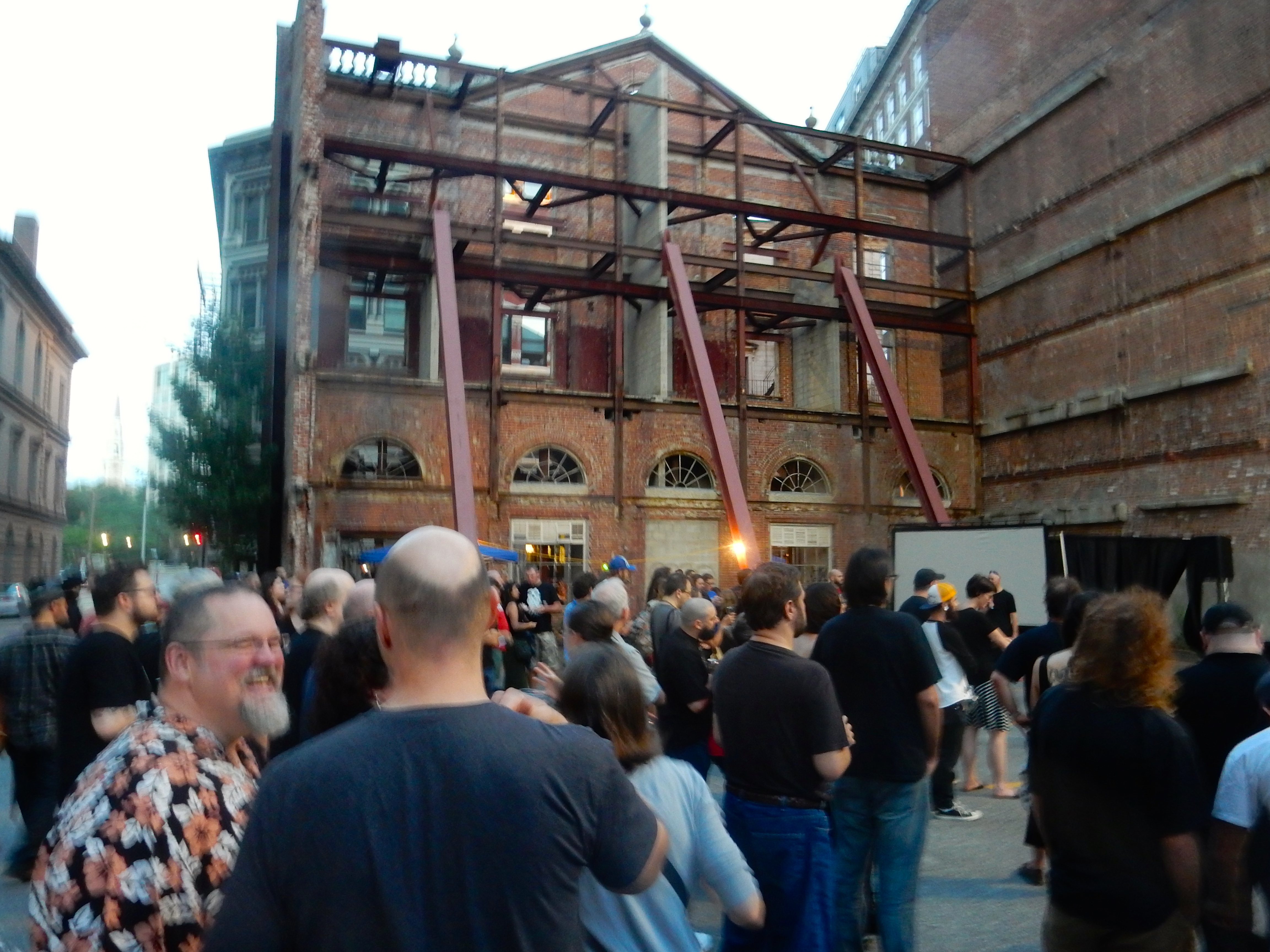 The convention celebrating the 125th birthday of, and all things relating to, H.P. Lovecraft hosted a party in the parking lot behind the naked façade, next to the Arcade, that is all that remains of the Providence National Bank Building. Built in 1925 on Westminster Street and extended in 1950 over to Weybosset Street, the bank was torn down, except for the 1950 façade, in 2005 to make way for a 40-story tower that fell through. Now it is a parking lot – owned by former Mayor Joe Paolino – and last night’s extravaganza put it back into real use again. It goes without saying that AGTWHBA.*