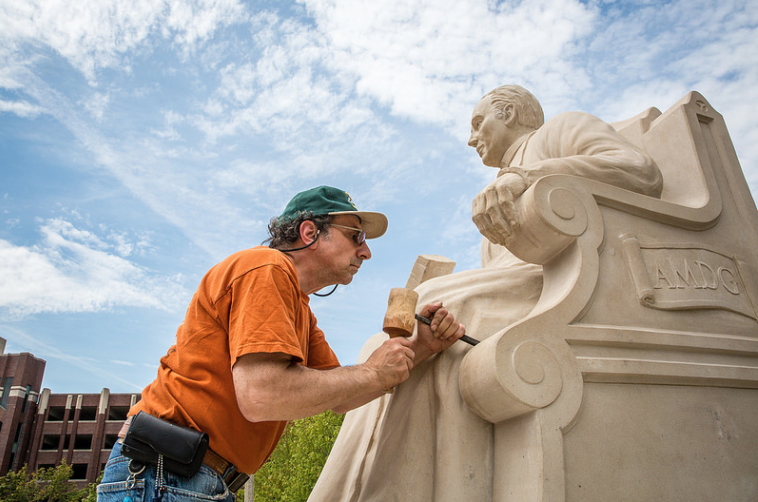 Walter Arnold’s sculpture of Father Arnold Damen, S.J., has just been installed at Loyola University, in Chicago, and the sculptor reports that returning students are already taking selfies with it, which he considers a sign of a work’s success in this day and age. In the series of photos released of the sculpture by the university, Walter seems to be applying some touch-up chiseling toward the end of the photo essay. I have asked him for details of what he is doing and will report back as soon as he supplies an answer.