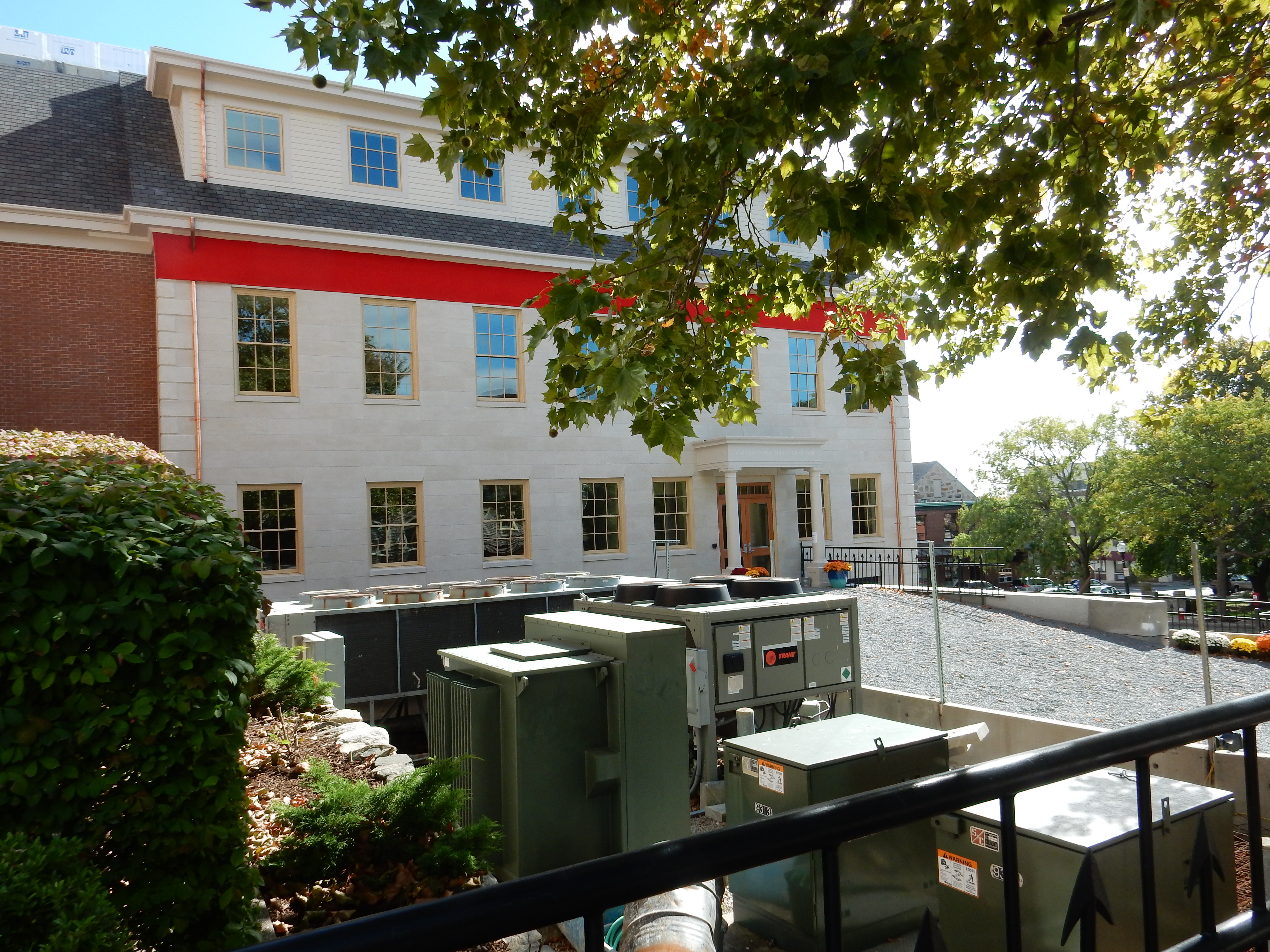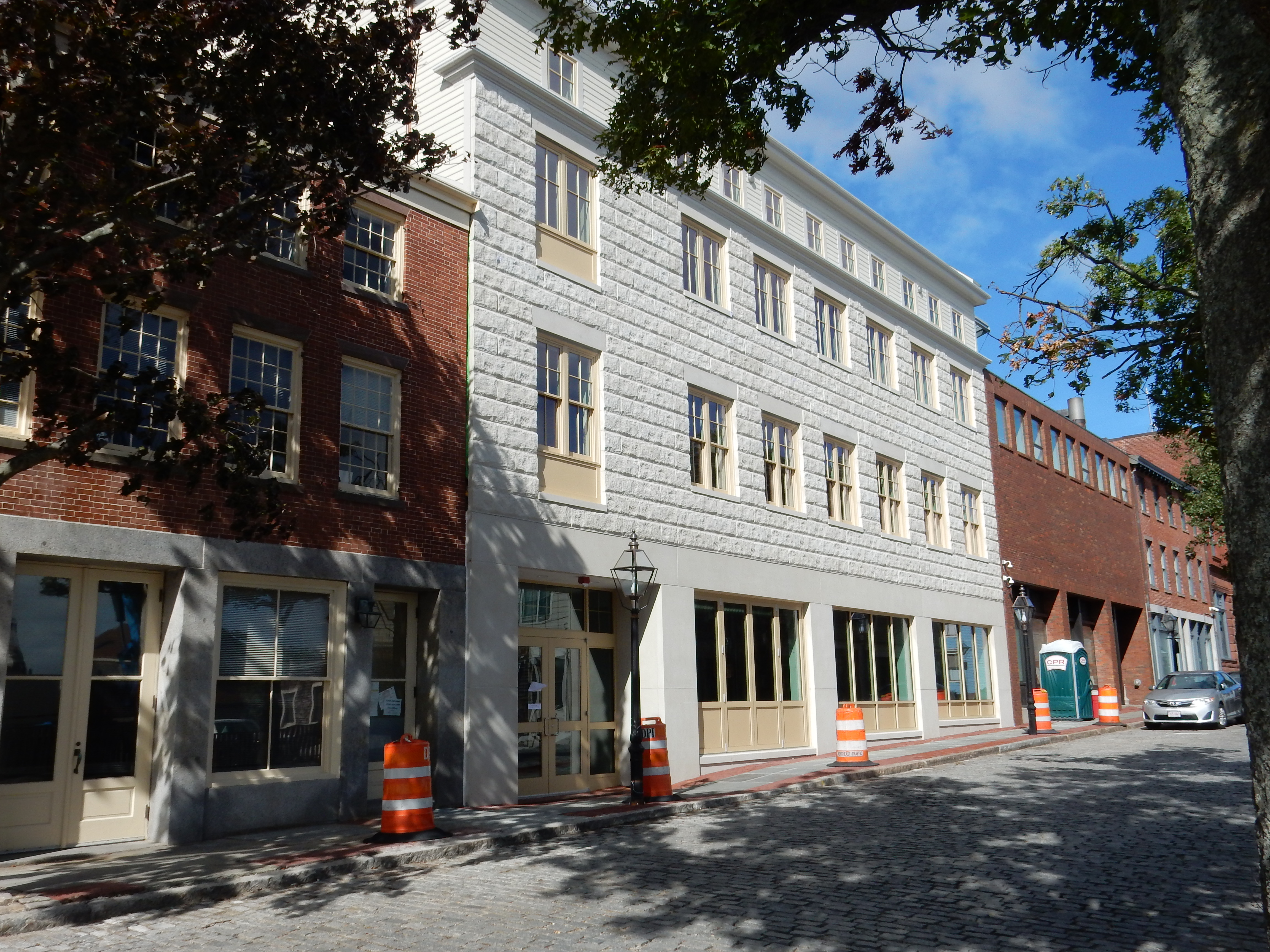 The two sides of the addition have different personalities. The side facing but set back from Johnny Cake Hill Street has the entry, and the genteel manners of an early 19th Century Federal mansion, with a fancy Doric portico and the red bow of a dedicatory ribbon still affixed beneath its cornice. Above it rises an attic story, with another ornate cornice, set into the building’s steep gabled roof. The “rear,” facing North Water Street, dons an early 20th century neoclassical face – base, shaft and capital – spare, but with a twist. This is the rusticated stone, placed unconventionally in the middle (the second and third floors) rather than at the ground floor, which in this case is smooth white masonry. The small windows of a fourth story partly mask from below a fifth story, fronted by the balcony of the Harbor View Terrace, a gallery and event space for guests and visitors.