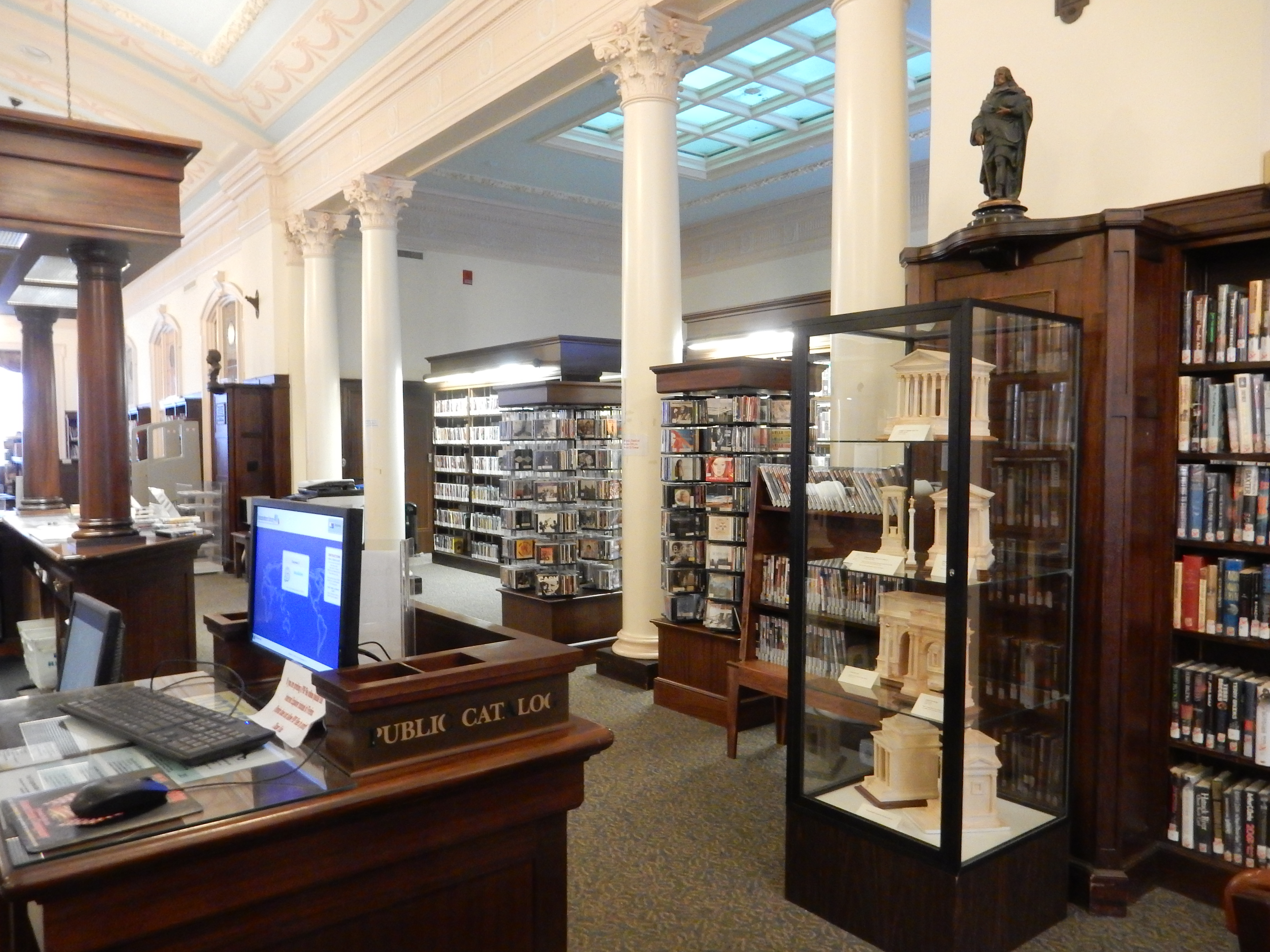 Your intrepid correspondent met on Friday at the William Hall Free Library, in the Edgewood neighborhood of Cranston, with Clayton Fulkerson to view his models of ancient temples, now on exhibit there through the rest of this month. The library, built in 1927, is also very much worth seeing. Clay and I were shown around by head librarian Adrienne Gallo.