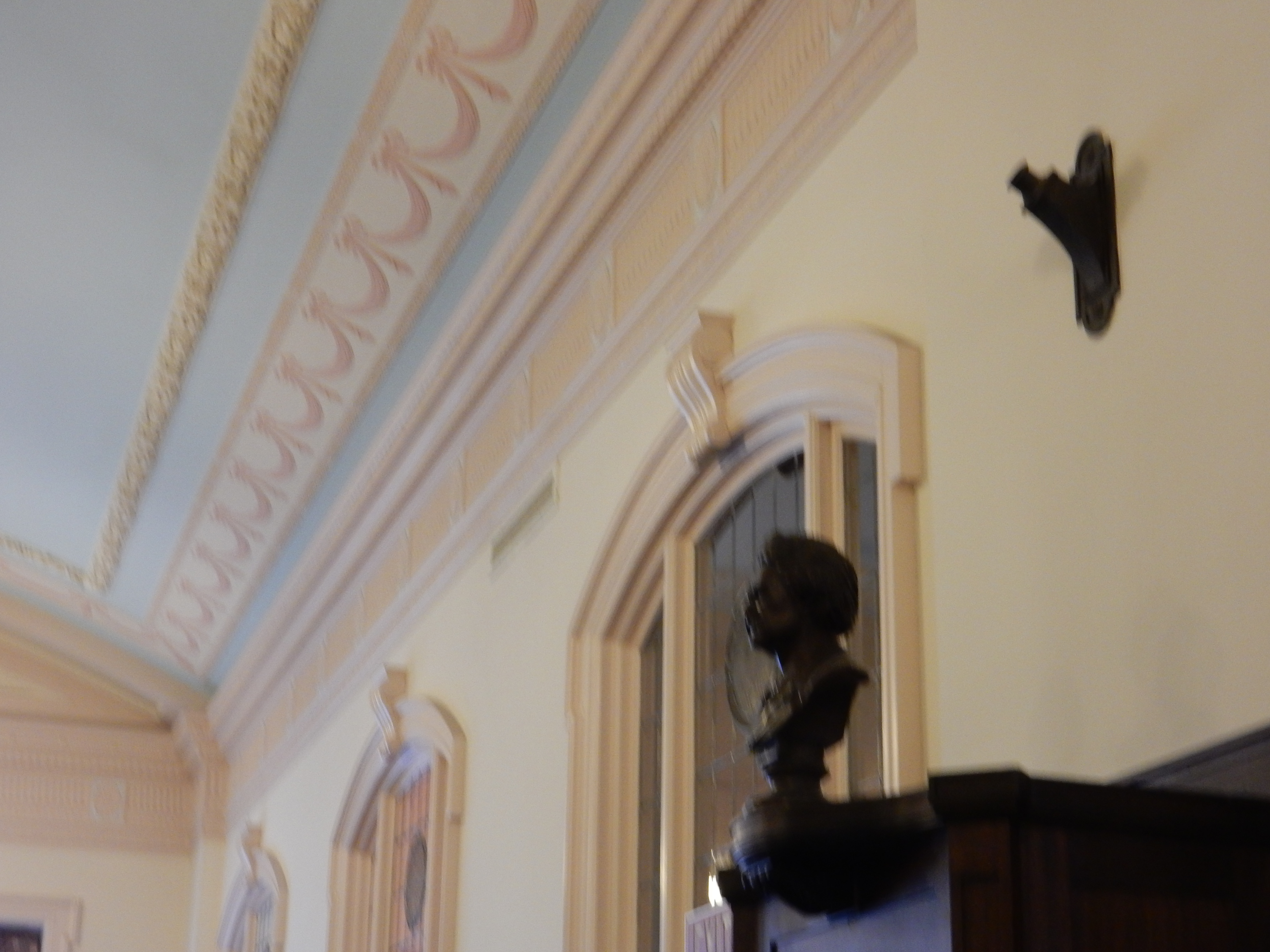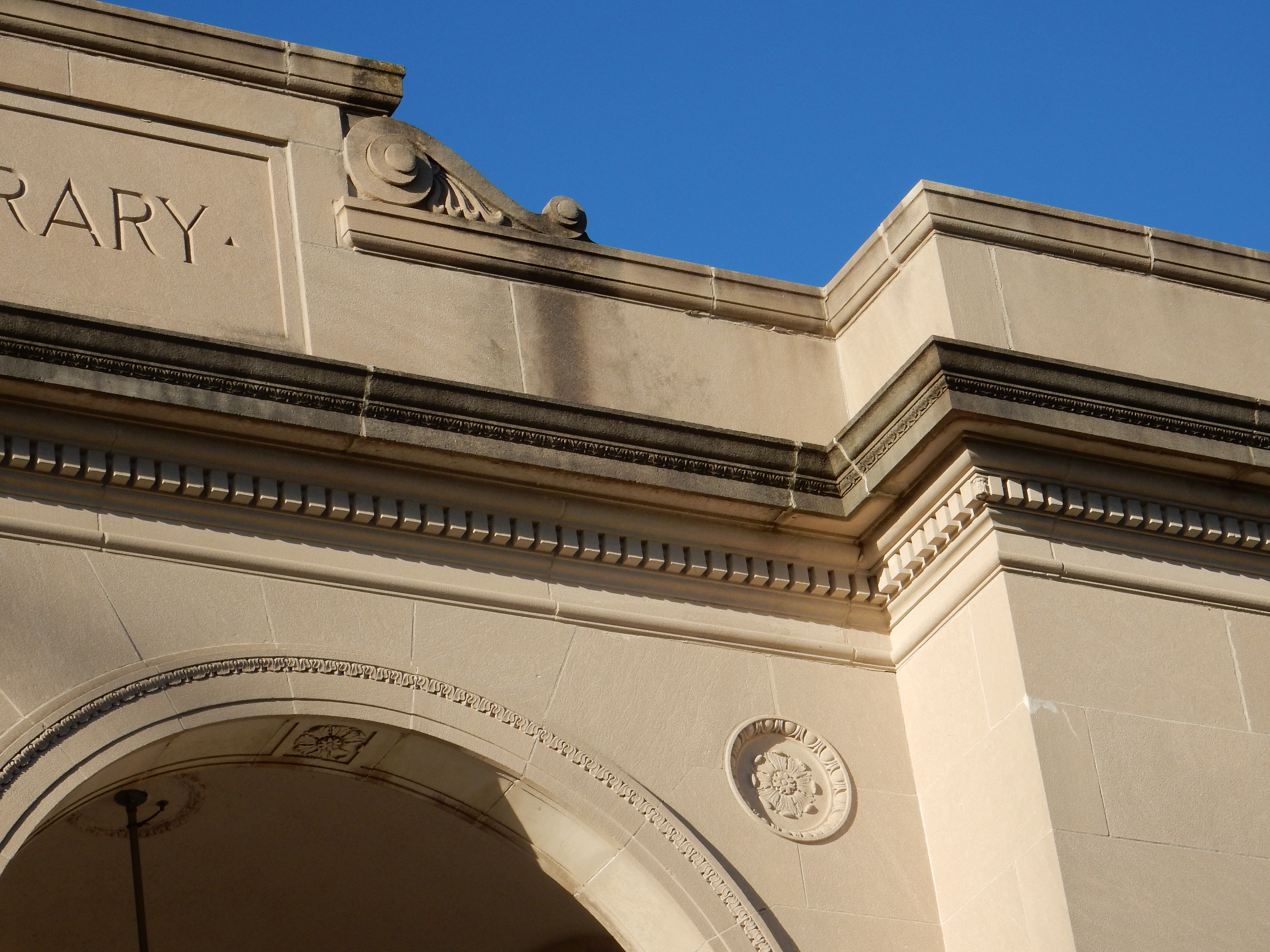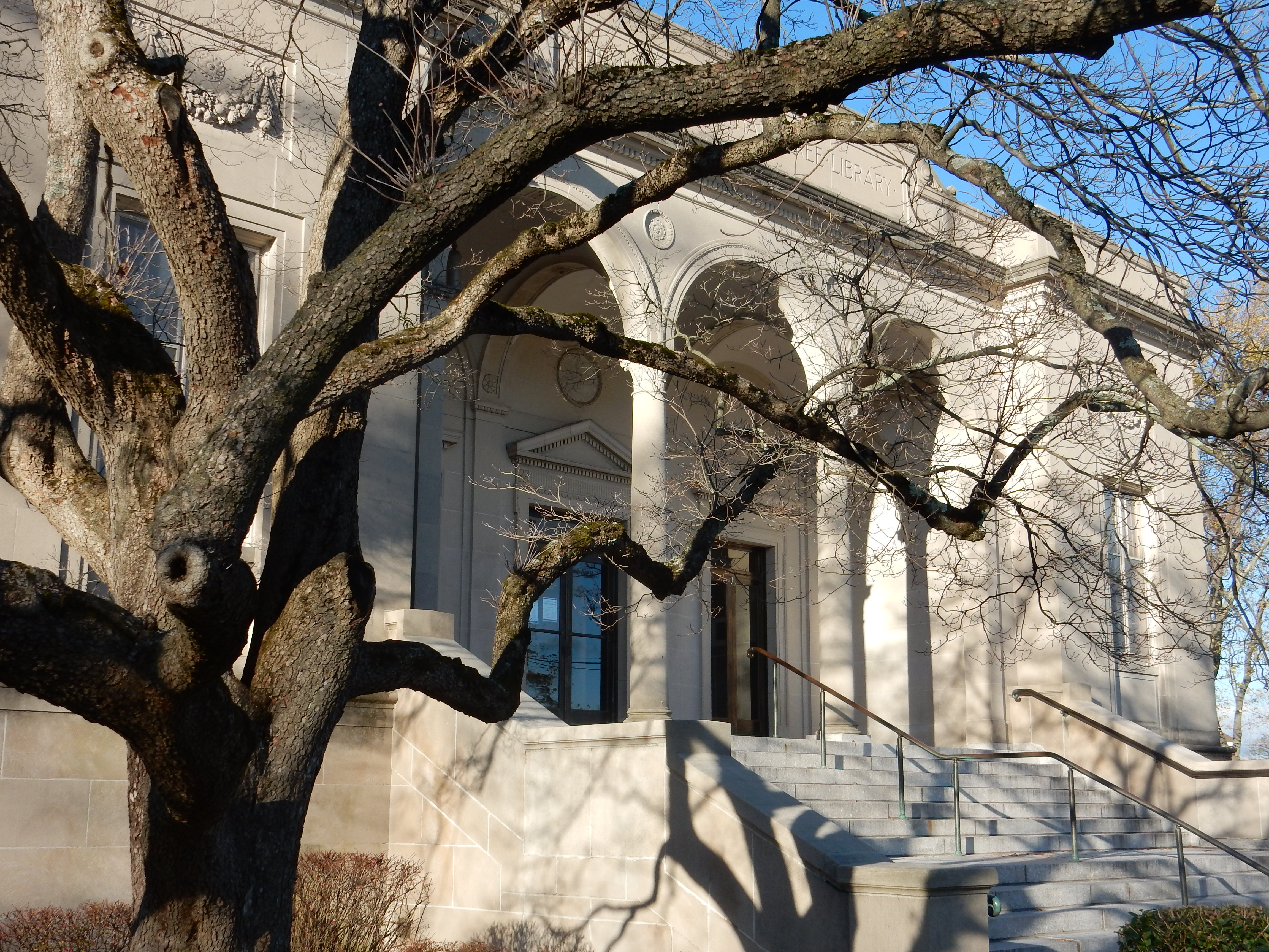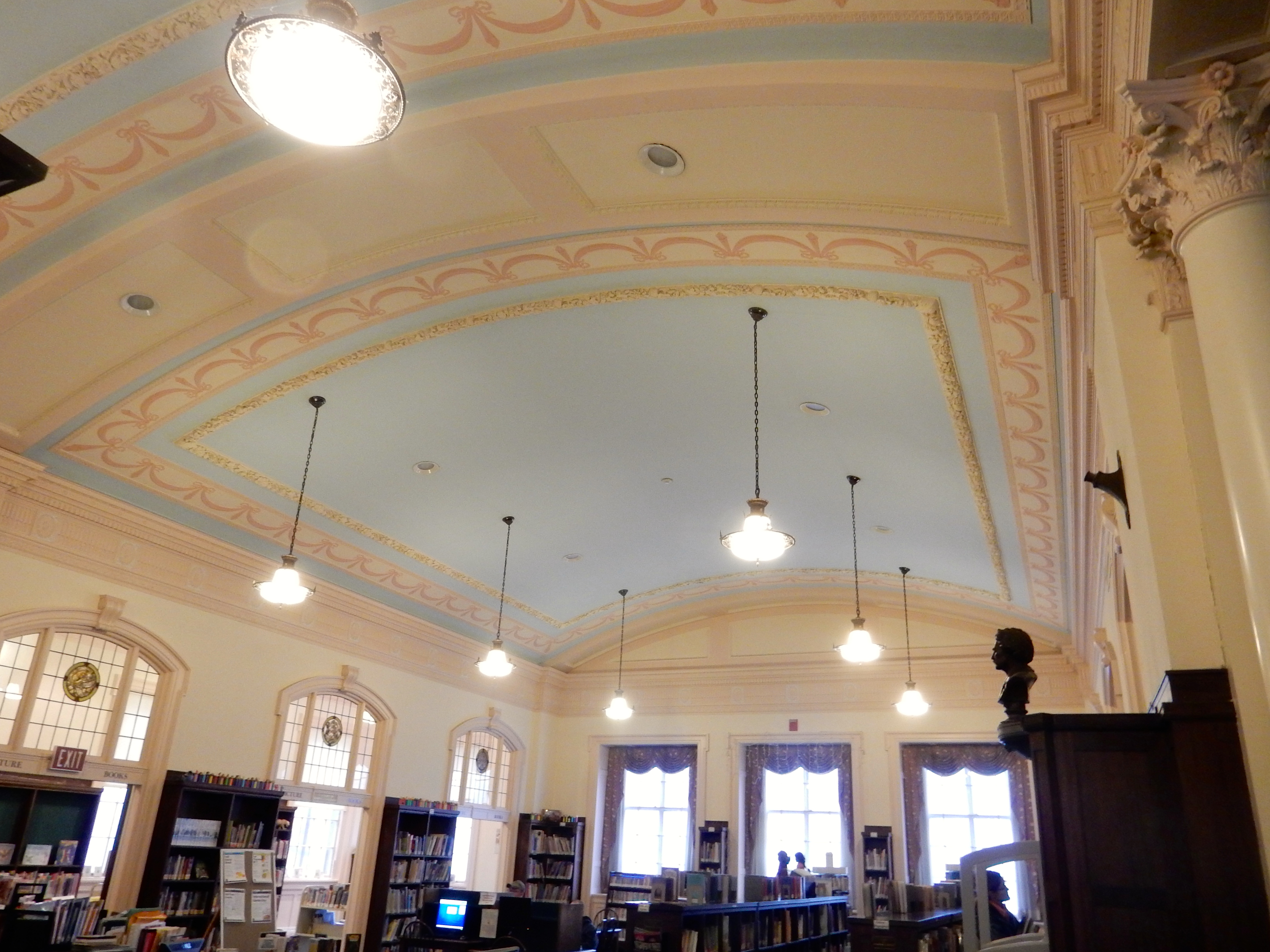 The slender grace of the library’s Renaissance Revival entry portico, with its three arches, lightens considerably the architecture of the structure as a whole. The original bronze doors remain intact. They are light and heavy at the same time. Heaving them open to enter leaves a powerful impression of quality that reminded me of the doors of the Rhode Island Convention Center; but the library only cost $275,000 ($3.7 million in today’s dollars).