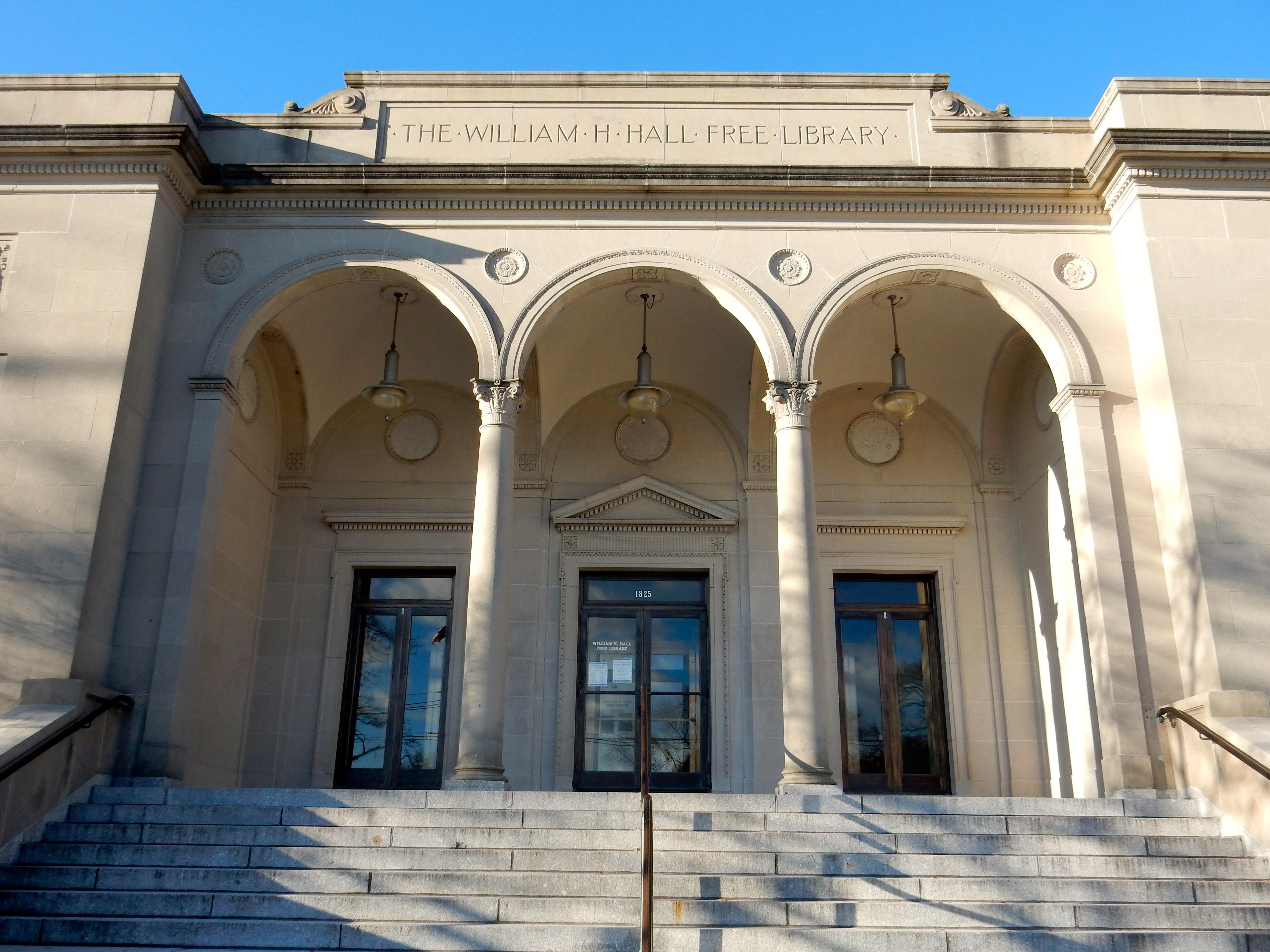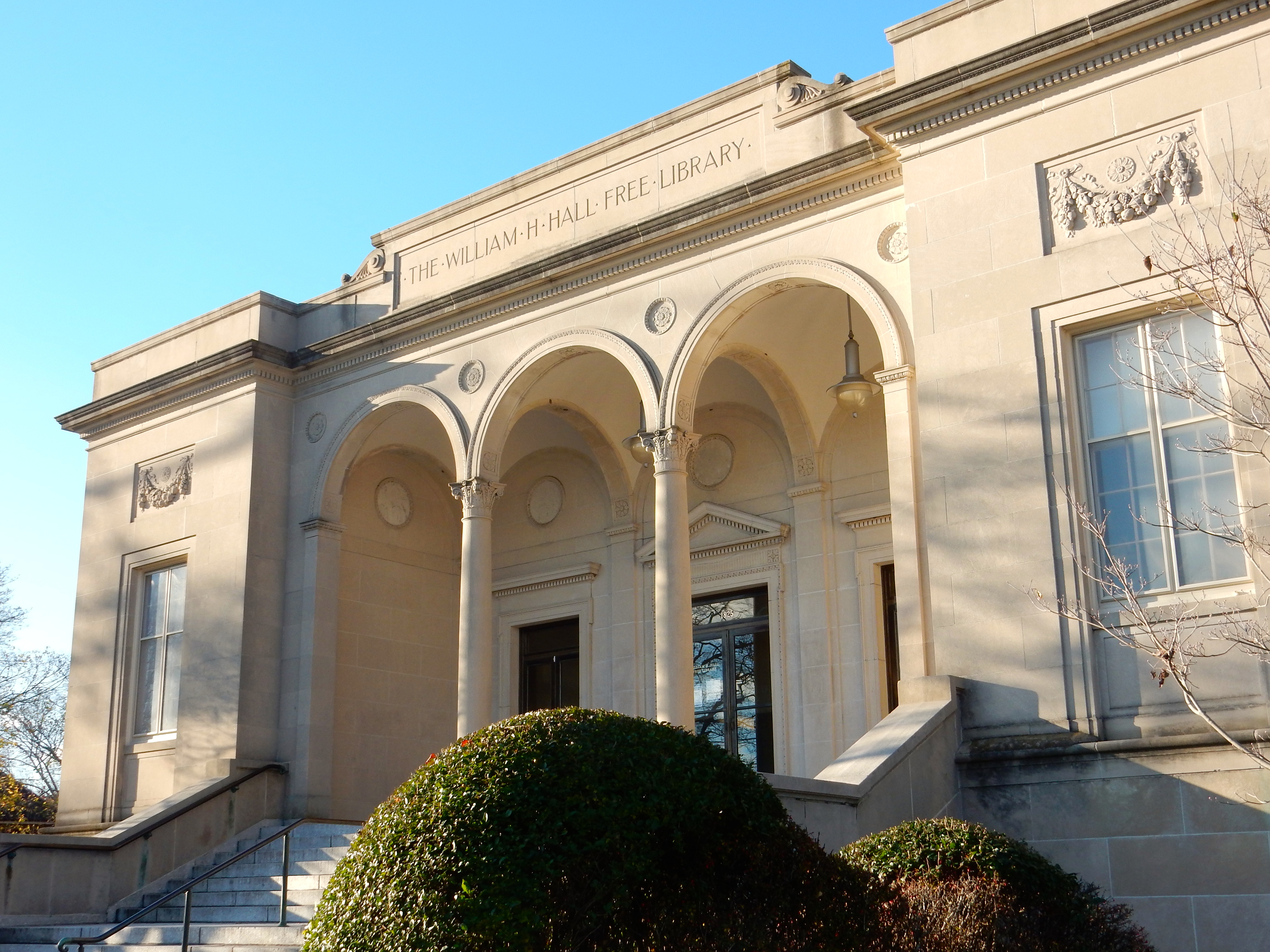If one is not prone to use superlatives, an attempt to describe the new William H. Hall Free Library presents a difficult task, for it is a building of rare beauty, approached on every side by wide terraced lawns and girded by rows of elm and pine trees.