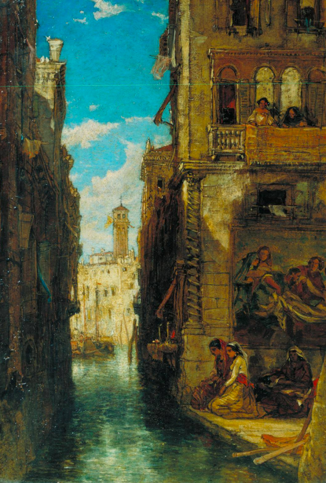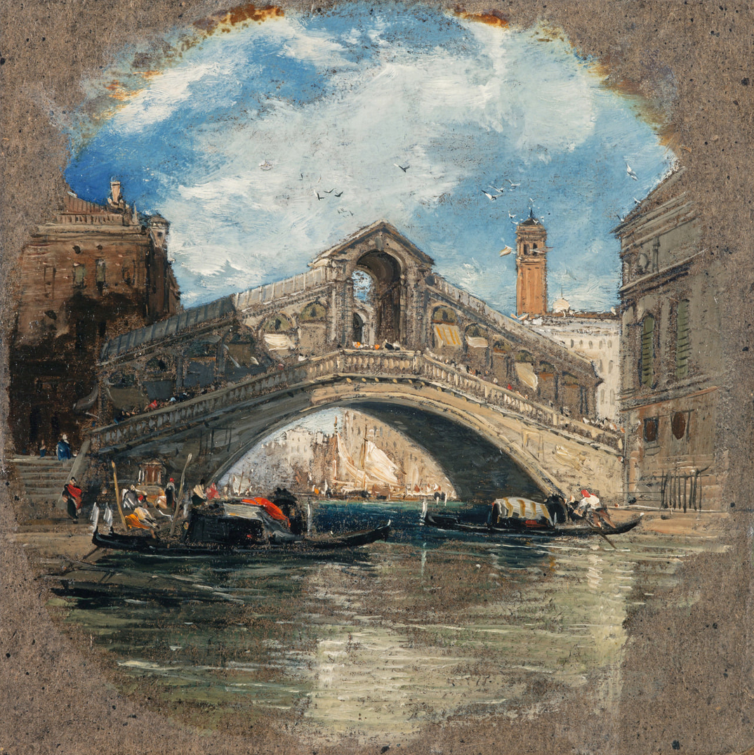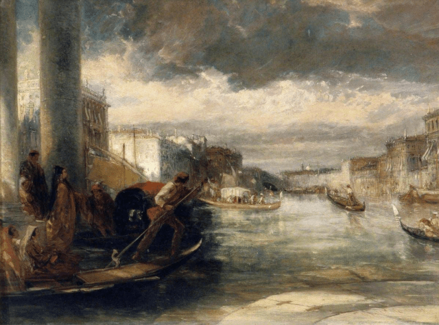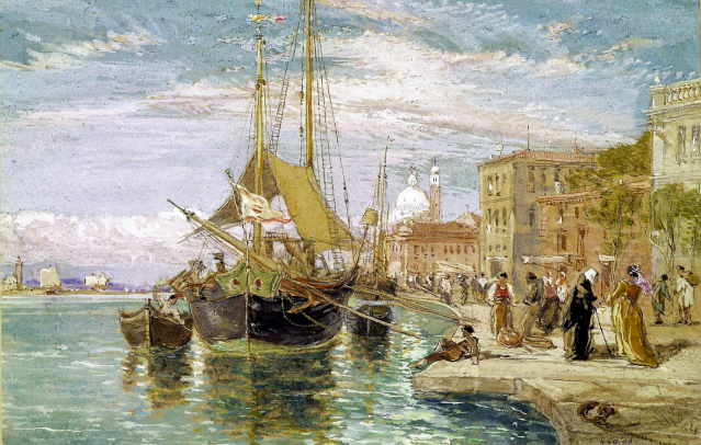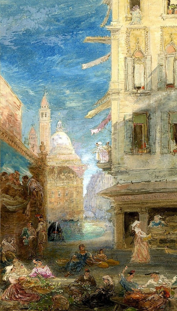 You can see, in these watercolors of Venice, the outlines of buildings that might have been drawn with the tools of the draftsman. Readers of greater knowledge of painting techniques will, I hope, reveal whether Holland drew with his eye or used tools to assist his eye, and then washed the scene with watercolors. In some of these the etchings seem to be more evident than in others as a base for the architecture. Look and enjoy! (Click to enlarge.)