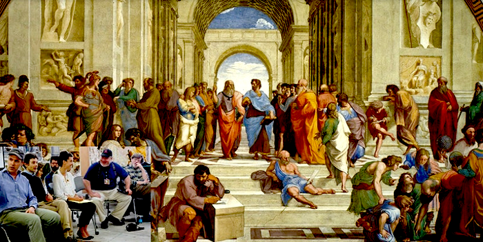 Raphael’s fresco of his colleagues as ancient philosophers. TAG 1 participants cut in at lower left. (museivaticani.va)