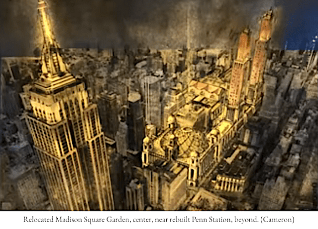 Add to this the prospect of new buildings in traditional styles – chief among them a Madison Square Garden relocated, possibly, to nearby Herald Square and redesigned to reflect the second Madison Square Garden designed by Stanford White of MM&W that once overlooked Madison Square Park. Also imagine the host of parks, parklets and squares recently proposed to grace the station area by architect Richard Cameron, who years ago brought the idea of rebuilding the original Penn Station into public view.