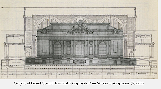 Imagine, for a moment, that Penn Station has now been rebuilt. The practicality of the task as a matter of engineering defies the image most of us have of its impossibility. Almost the entire structure of the original station remains intact beneath existing retail and waiting/ticketing levels above the original tracks and platforms, including the load-bearing piers that uphold those levels and Madison Square Garden above. Original blueprints survive for the passages, chambers, utilities and other features in, out, and around Penn Station. With advanced computerized stonecutting equipment and digital techniques of ornamentation to cut and mold cast stone, there is no need to import thousands of stoneworkers from Italy. Washburn recently wrote in Crain’s that,