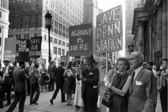 Protest against demolition of Penn Station. Philip Johnson at far right. (Getty)