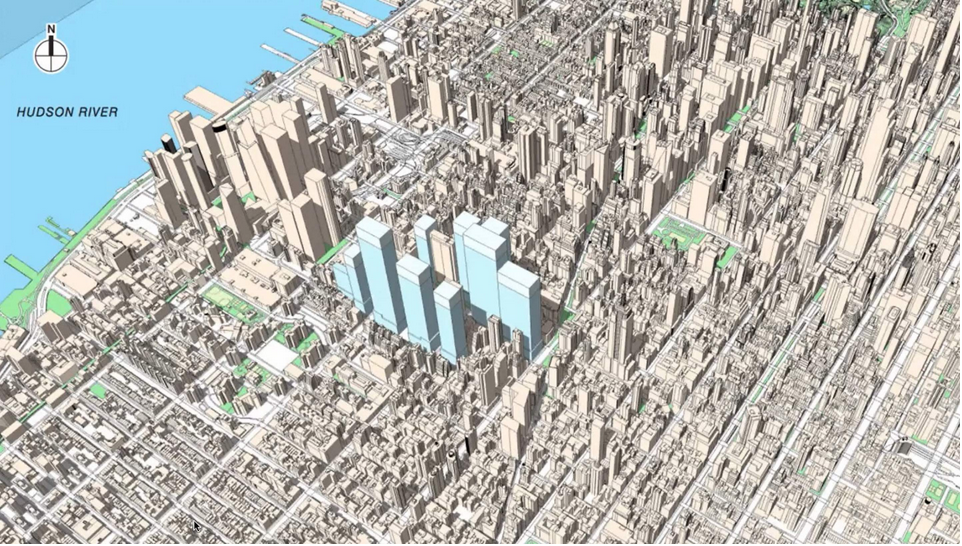 The official project description provided by the Empire State Development Corporation‘s environmental impact statement contains no attempt to describe the appearance of the proposed “transit-oriented commercial district.” It is as if the appearance of buildings has no impact on our civic environment. Only the square leasable footage envisioned by developer Vornado Realty Trust matters. Only the list of proposed building heights offers any feel for the eventual result. The heights, as listed, would range from the tallest at 1,300 feet on downward to 1,270, 1,130, 1,052, 1,018, 975, 936, 748, 664 and 235 feet. (The Empire State Building rises 1,250 feet.) The massing of buildings on the EIS maps is speculative, though perhaps not more so than the heights themselves.