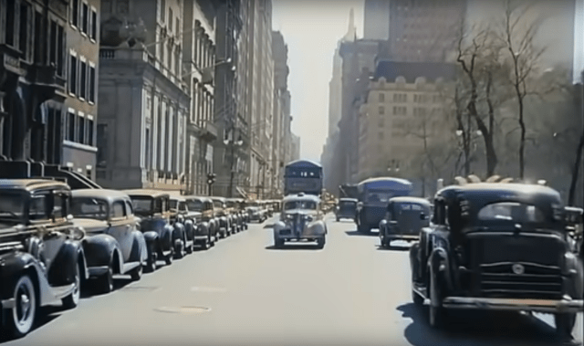A time travel in New York 1930s. We can clearly see what is happening in broad daylight, I believe it starts at 51st Street and rides along Fifth Avenue for the rest, right next to Central Park.