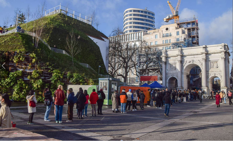 The Mound is a steep, hollow, fake hill with some trees. It opened next to the Marble Arch last summer, costing $18 million to build and $6 to climb. It was supposed to be a tourist attraction to help the Oxford Street shopping district cope with covid.