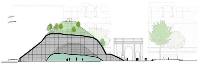 [After publication I was informed that the Marble Arch Mound covered a Blitz-era WWII bunker next to the arch. In a couple of dozen articles from the time of its initial opening last July 26 to its recent closure, including Wikipedia, I could find no mention of such a bunker’s existence or its dubious rationale for the Mound. A bunker near Hyde Park Corner served as a refuge for Winston Churchill during the London Blitz at a corner of the park well away from Marble Arch. It does not show on the diagram below, nor was it supposedly demolished prior to the Mound’s construction. But I did learn that the Mound was originally expected to close on Jan. 9, which it did, that it was to be removed shortly after, and that its trees would be replanted on London streets and school grounds. There remains no thinking that I could discover regarding plans for a replacement, if any. The most extraordinary thing I learned via this additional research is that the original plan for the Mound was for it to cover up the Marble Arch itself. This plan was rejected, not because it would have been insane but because it might have damaged the arch.]