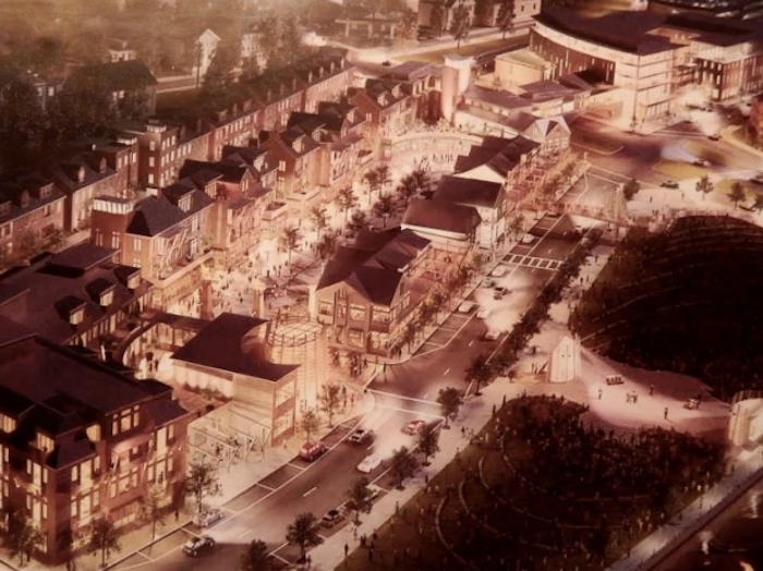 The commission has seen fit to do none of this, and as a result the banks of the Providence River between the new Crawford Street Bridge to the north and the Point Street Bridge to the south are an unholy horror. The only proposal I have seen that might have fit in the Innovation District was the Carpionato Properties development plan of 2013, Its pair of large parcels were not subdivided, but they hosted many small and elegant buildings. For some reason the proposal did not pass muster with the commission and so it disappeared into the mists of recent history. (See illustration below.)
