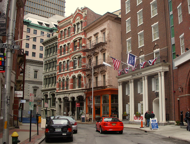 The fabric of these streets rivals and in most cases surpasses, in intactitude, those of more famously preserved cities in America, such as Charleston, Savannah, Portland (Maine), parts of downtown Boston, and others. Most of these cities are rightly celebrated for their intact historic neighborhoods, and for intact historic districts within their downtowns, but their downtowns as a whole have been far more blighted with modern architecture and vast parking lots than downtown Providence, which, it should be noted, extends to historic fabric just across the river on College Hill that rivals, in size and quality, historic neighborhoods anywhere in the country.