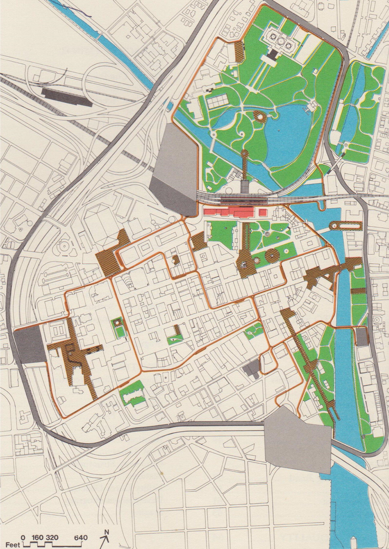 Map of Interface:Providence Plan, from 1974. (Author’s archives)Both major plans for the two most celebrated historic districts in Providence, downtown and College Hill, were steeped in modern architecture. Not so with the next major plan to emerge, “Interface: Providence,” published in 1974 after a study led by RISD professor Gerald Howes. Although initiated as a transportation study by way of a class project, it eventually became the first plan to uncover the city’s downtown rivers. Thus did it foreshadow the River Relocation Project of the 1990s.