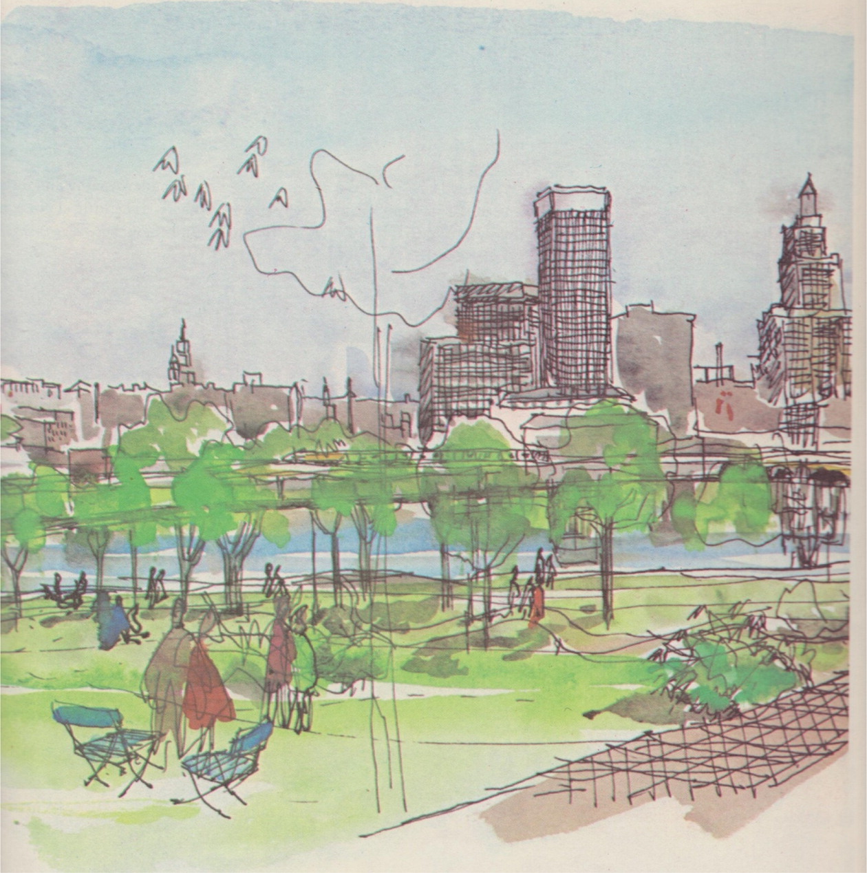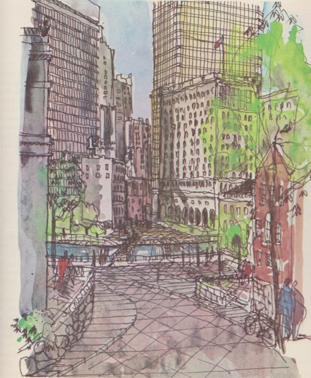 View of downtown from north of water feature near State House. (Author’s archives)The second half of Chapter 17, “The Interface Plan,” opens with a continuation of comments on architectural trends in the early 1970s and then describes the Interface: Providence plan at some length, including several illustrations not included in Lost Providence. The “turmoil” referred to in the opening sentence below refers to the accurate critique of modernism by postmodern theorists, who nevertheless refused to follow up their critique with anything beyond a sort of cartoonish classical decoration of modernist boxes.