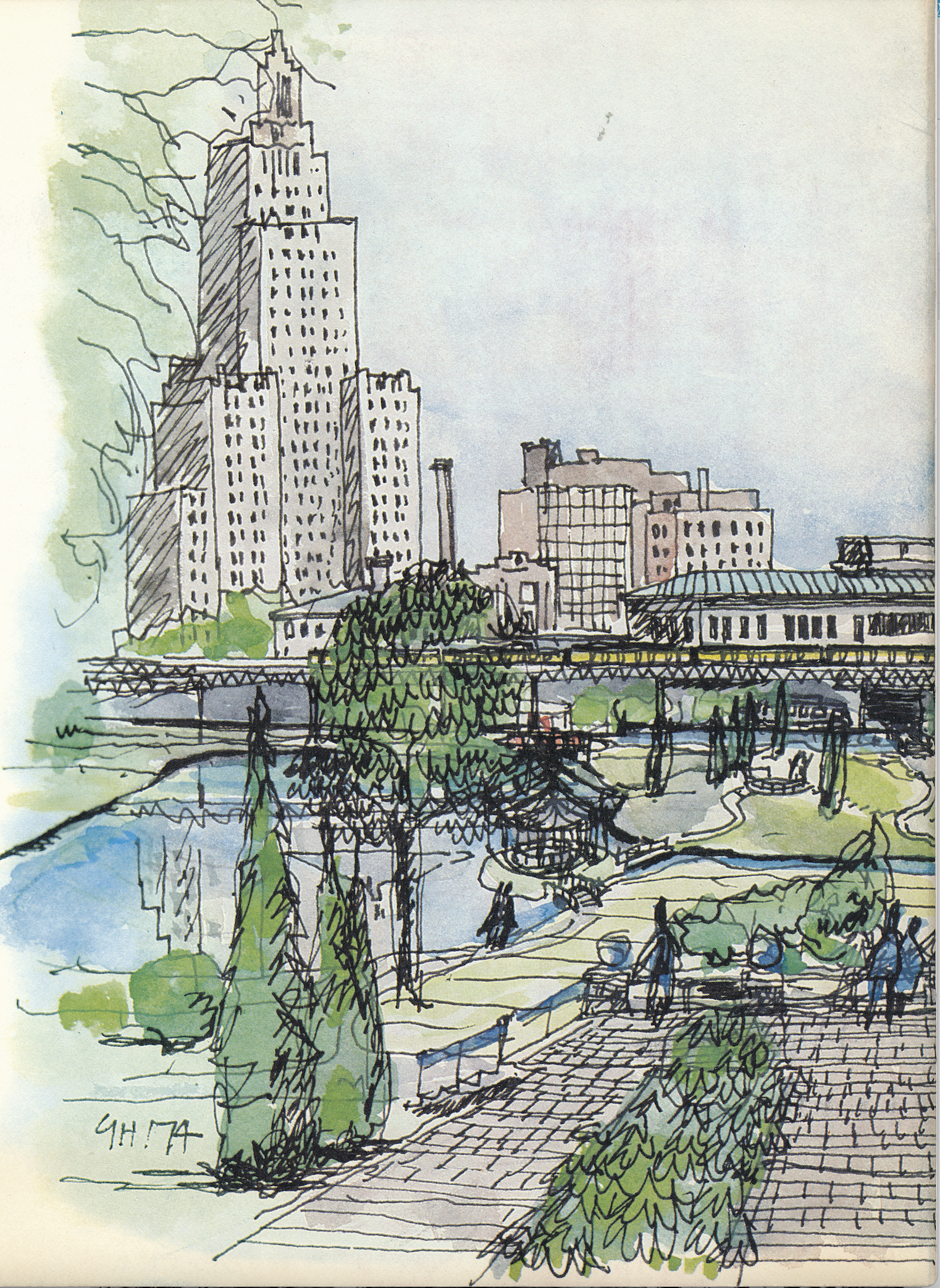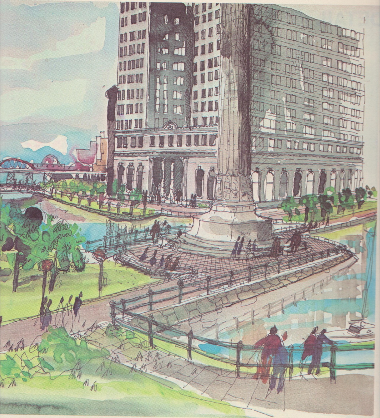 View of Hospital Trust Building over Providence River at base of College Hill. Note that WWI memorial remains at original location, with Suicide Circle removed. (Author’s archives)After commenting on the extraordinary ability the downtown layout affords the average person to orient themselves geographically and to identify primary uses of downtown areas by their appearance, the authors state: