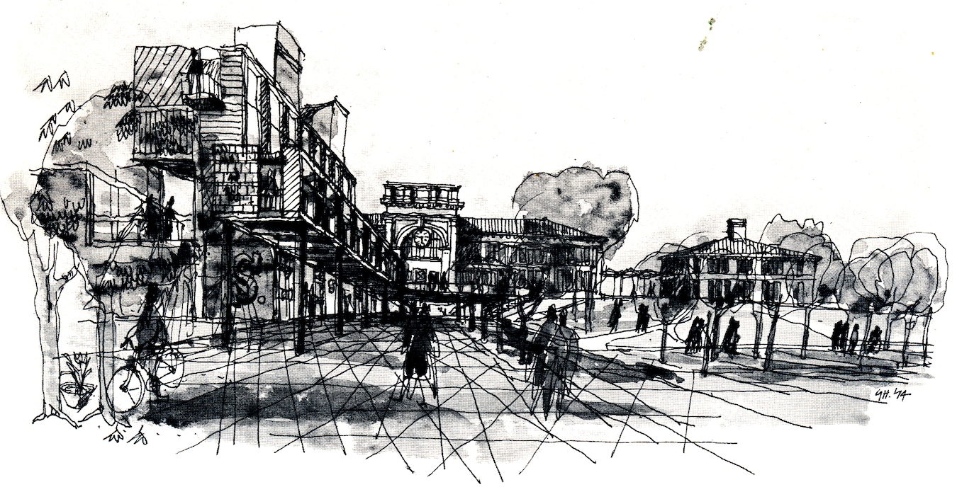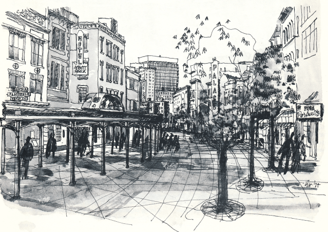 Modernist residences and shops in Kennedy Plaza. (Author’s archives)The Interface plan might also be characterized as neutral on the question of architectural style. That was a big step in the proper direction. Yes, it featured, in Kennedy Plaza, a small version on stilts (page 88) of Montreal’s Habitat ’67 – the stacked modular residential development designed by architect Moshe Safdie. But it also proposed a PRT – personal rapid transit – circulating through downtown on tracks raised above the street level by a “colonnade” of clearly traditional design (page 120). The plan’s gently quavering illustrations express a pleasure in the city’s built environment that is incompatible with plans to remove or cover up its longstanding architectural delights.